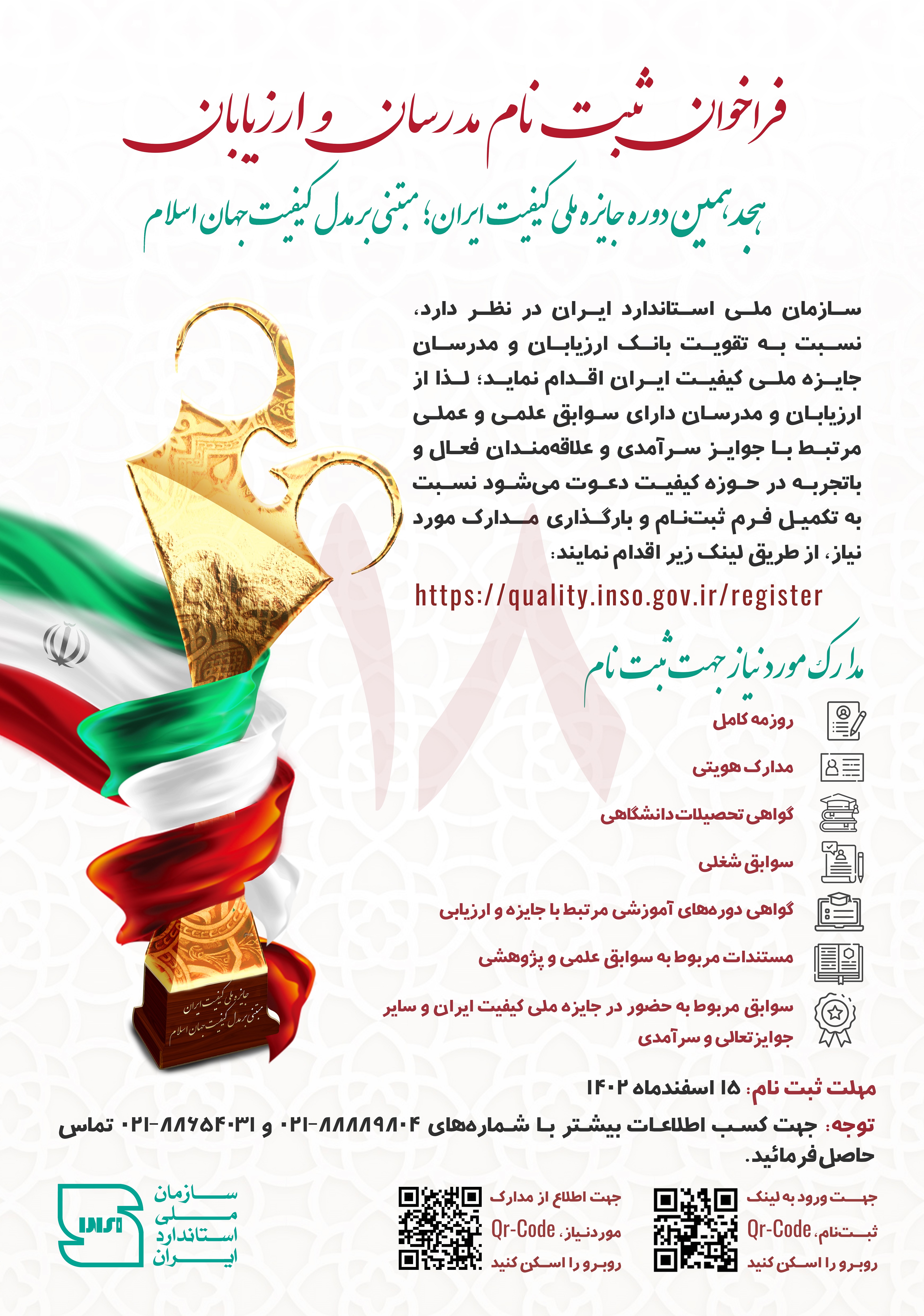 اطلاع کلیه متقاضیان حضور در هجدهمین دوره جایزه ملی کیفیت ایران می رساند، ثبت