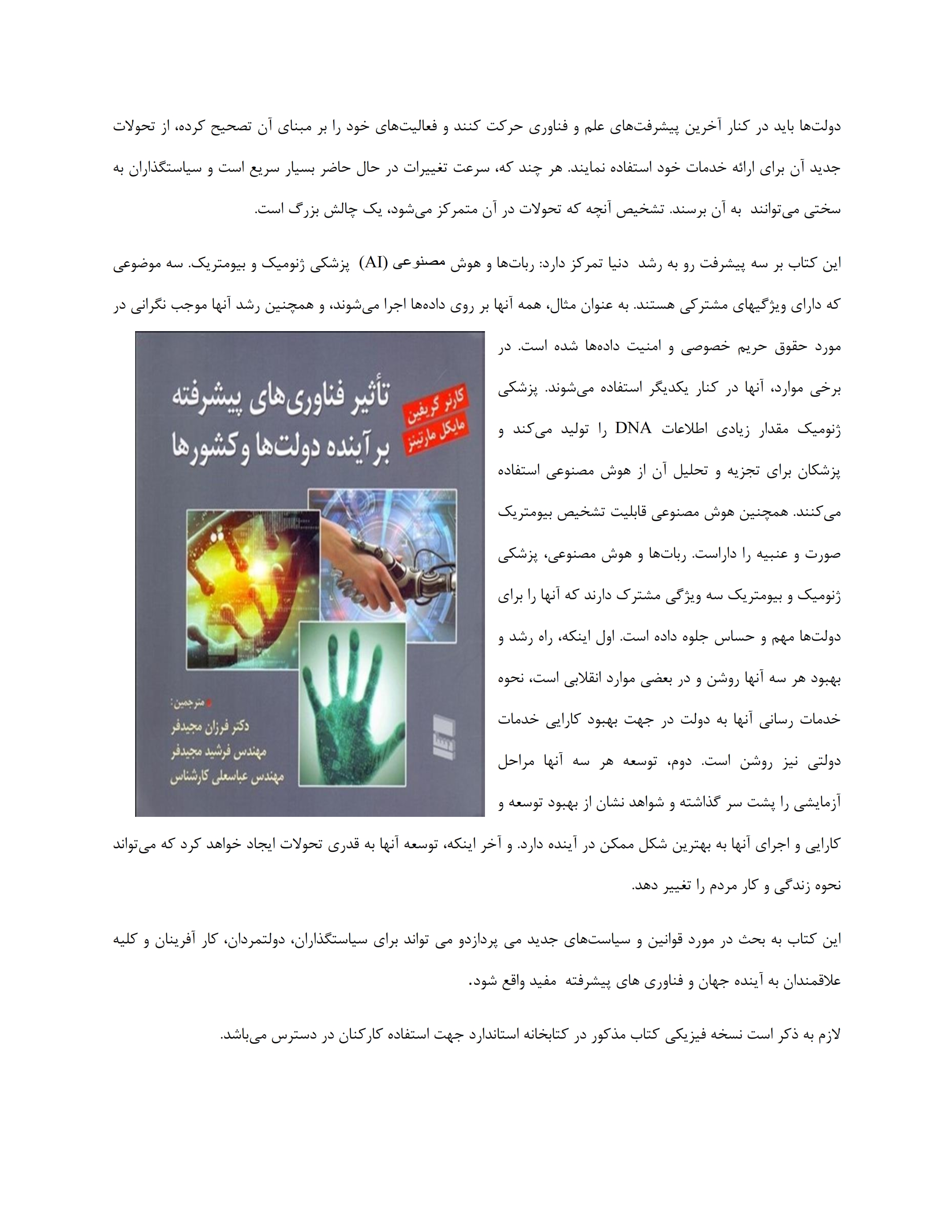 معرفی کتاب تاثیر فناوری های پیشرفته بر آینده دولتها و کشورها ۲۲ اَمرداد ۱۳۹۸ ۰۴:۳۱ 33EA92EF-F53A-4B9A-9CBF-AAA80094BC4C | تعداد بازدید : ۱,۳۱۹ اخبار مرتبط معرفی کتاب آموزش مهارتهای زندگی معرفی کتاب مدیریت کاربردی جلسه معرفی کتاب مهندسی رفتار ارتباطی معرفی کتاب معرفی کتاب انسان 2020 معرفی کتاب باز آفرینی