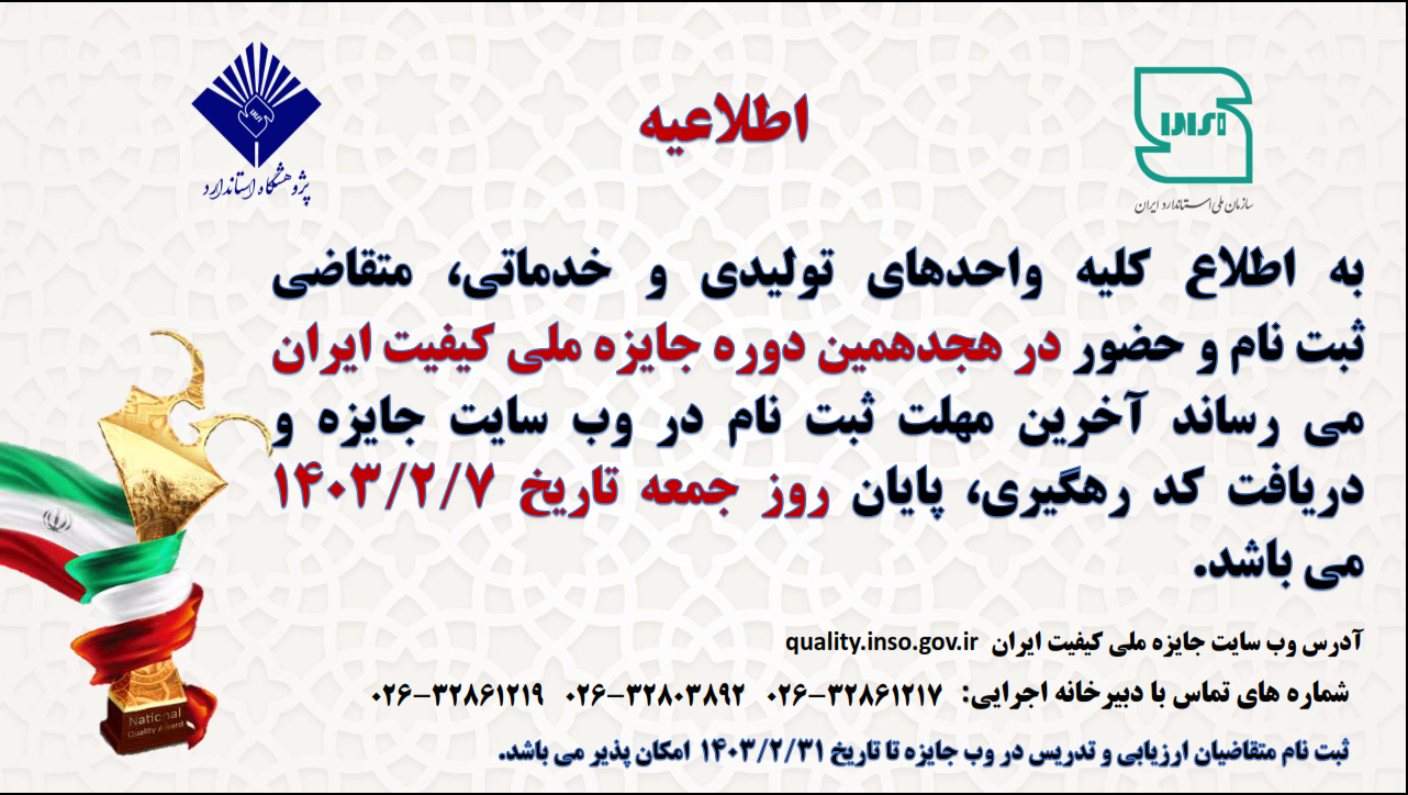 اطلاعیه آخرین مهلت ثبت نام در جایزه ملی کیفیت ایران مدل کیفیت جهان اسلام
